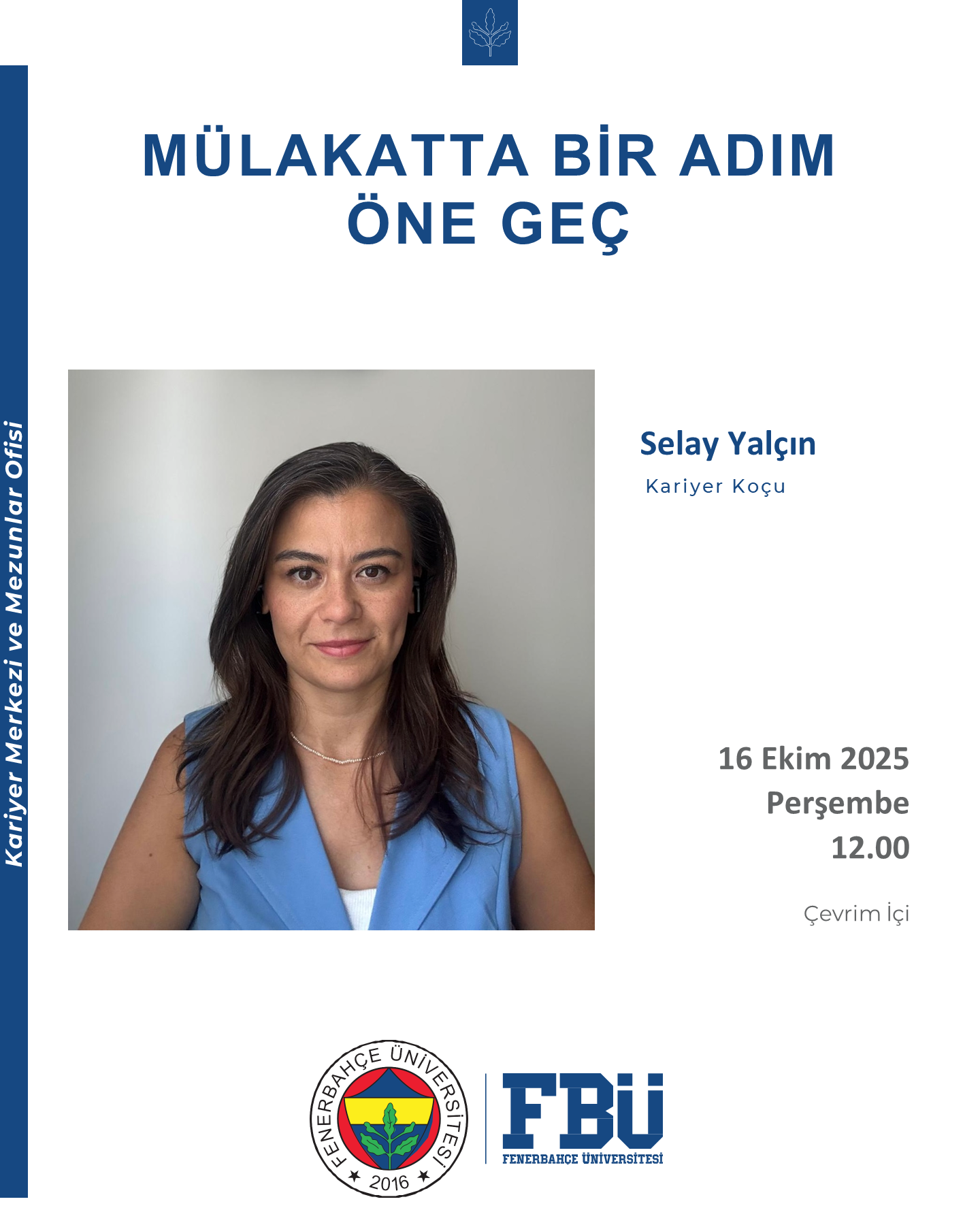 Bu özel oturumda Kariyer Koçu Selay Yalçın bizlerle olacak ve mülakat sürecinde fark yaratmanın yollarını, iş dünyasından değerli deneyimlerini paylaşacak.