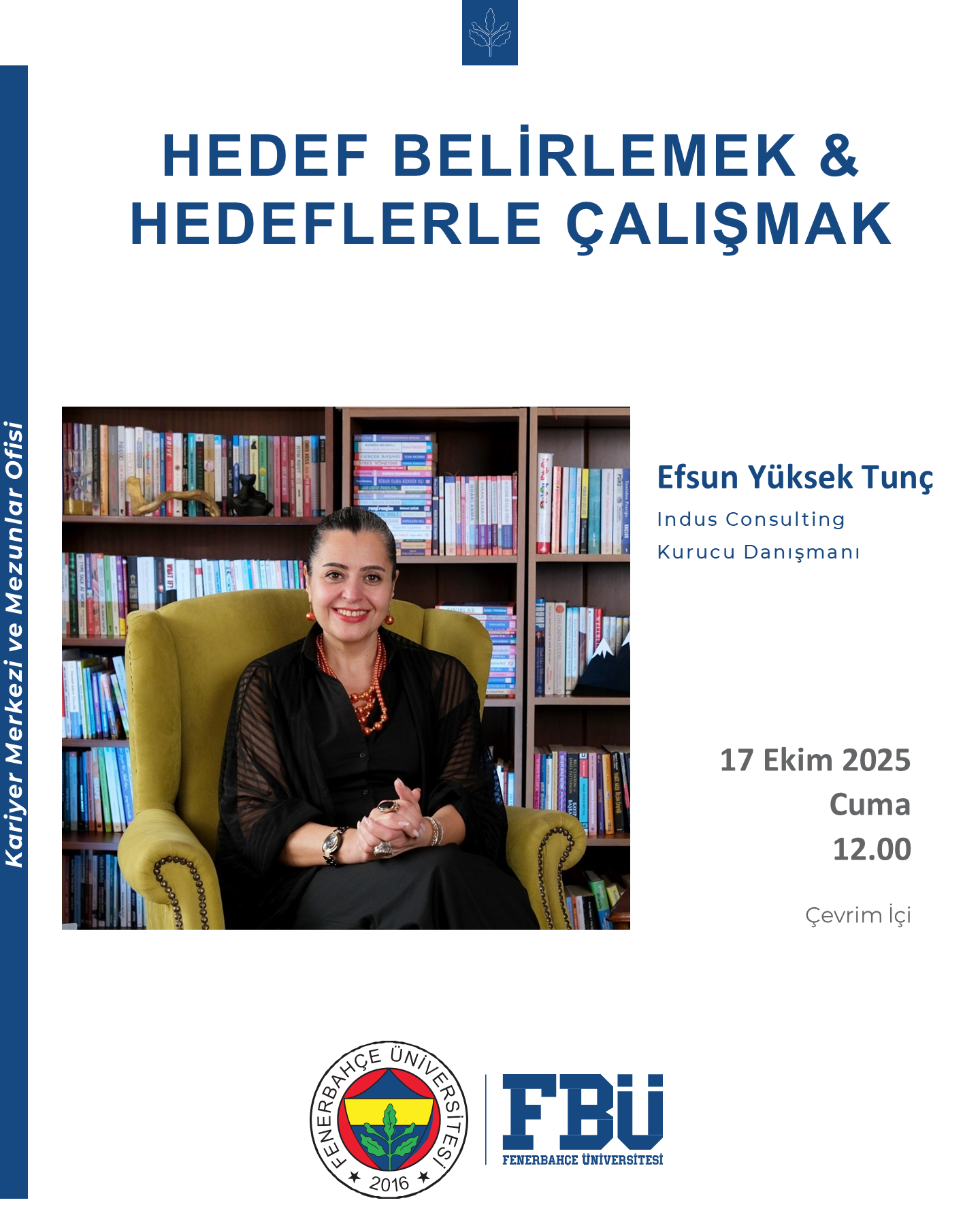 Bu özel oturumda Efsun Yüksek Tunç, Indus Consulting Kurucu Danışmanı, bizlerle olacak ve hedef belirleme, motivasyon ve iş hayatında hedeflerle çalışmanın püf noktalarını paylaşacak.