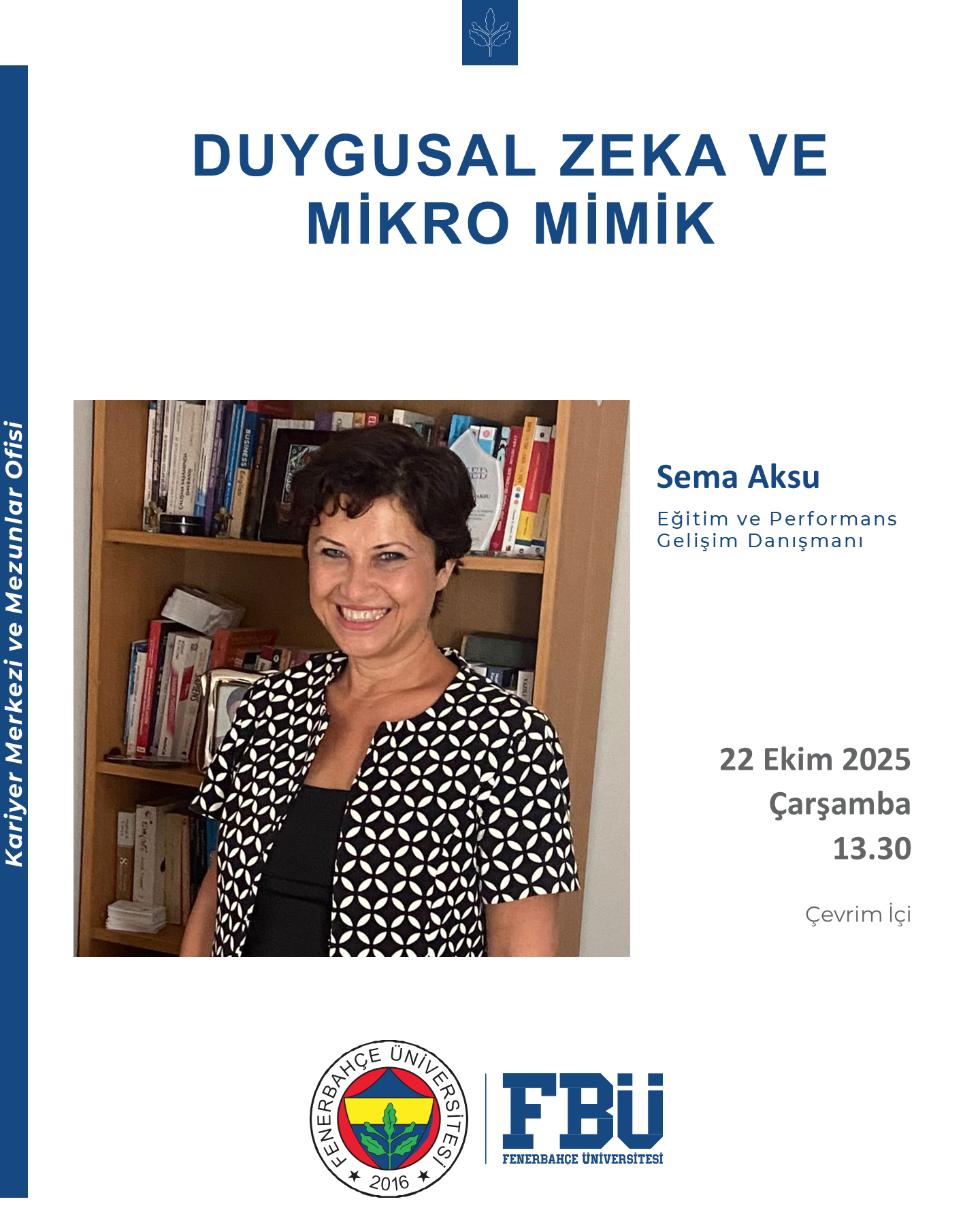 Bu özel oturumda Eğitim ve Performans Gelişim Danışmanı Sema Aksu bizlerle olacak; duygusal zekânın iş hayatındaki rolünü, mikro mimiklerin etkisini ve hedeflerle çalışmanın püf noktalarını paylaşacak.