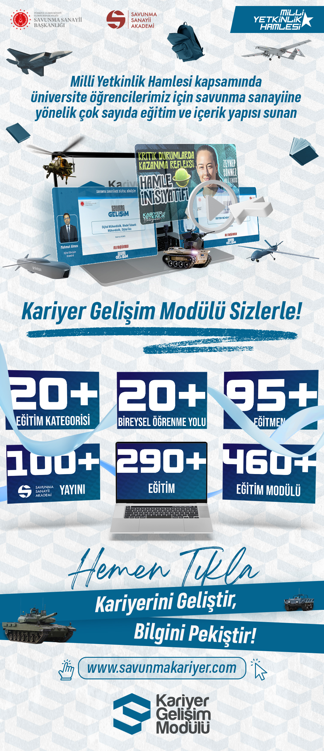 Milli Yetkinlik Hamlesi kapsamında hayata geçirilen Savunma Kariyer platformuna eklenen Kariyer Gelişim modülü ile artık 200’den fazla eğitim ve 1.000’in üzerinde içeriğe ücretsiz olarak erişebilirsiniz.